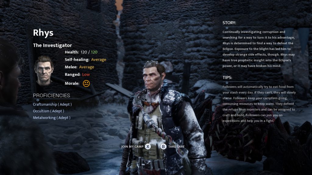 Op het allereerste moment dat ik mijn kamp verlaat wordt het survivalaspect van deze game al snel duidelijk. De lichaamstemperatuur van Ash dropt, hij krijgt honger. Zijn kampgenoot krijgt honger en dreigt te bevriezen als er niet snel een kampvuur aangelegd wordt. Ik besluit vaart te maken, maar de stamina van Ash raakt snel op, hij raakt vermoeid en her en der zijn er zeer agressieve Eldritch monsters die op hem jagen. On top off that heeft Ash ook nog rekening te houden met blizzards (sneeuwstormen) die onvergeeflijk zijn en niet zelden leiden tot het verlies van één van je spaarzame drie levens. Ik voelde dus direct de druk om buiten mijn kamp efficiënt en doelgericht te werk te gaan. En dat was in het begin lastig.